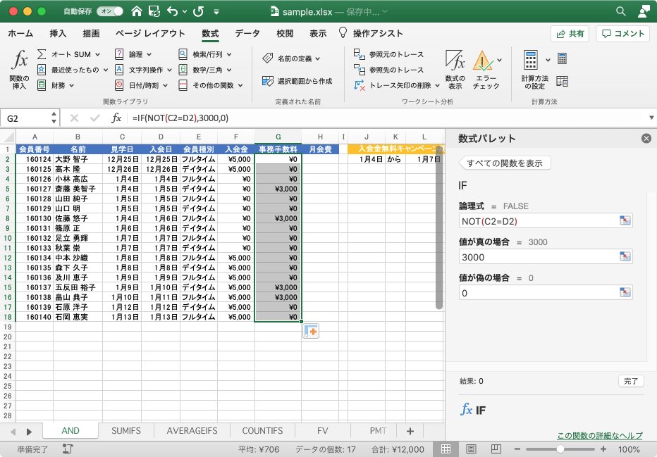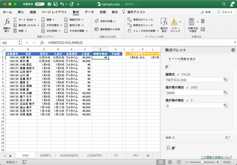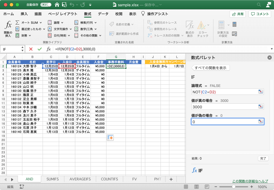 ここでは、見学日と入会日が同日でない場合に事務手数料3000、そうでなければ0を返す方法について説明します。