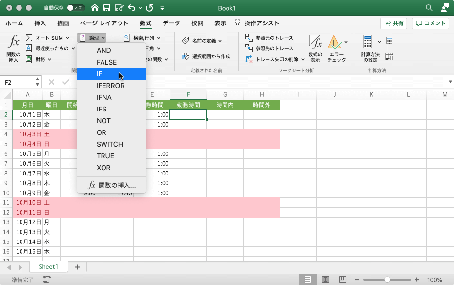 - 求めたいセルを選択して[数式]タブの[論理]関数より[IF]を選択します。