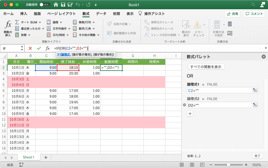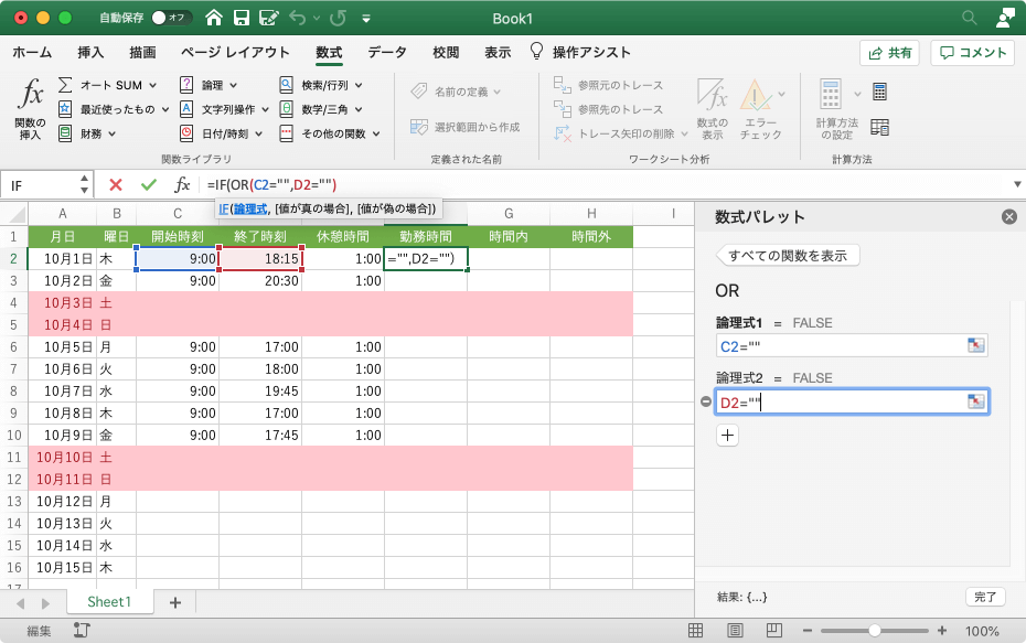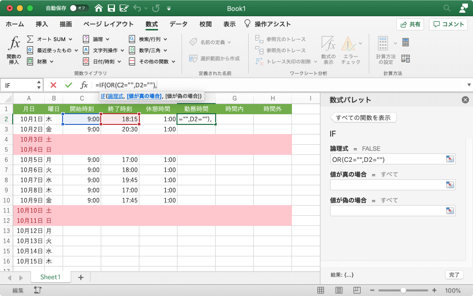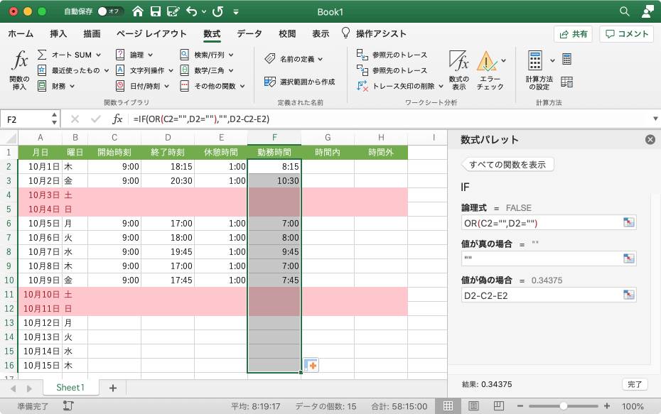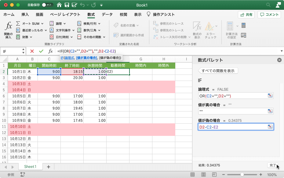 - [値が偽の場合]ボックスには、終了時刻-開始時刻-休憩時間 になるようにセルを指定して、[完了]ボタンをクリックします。