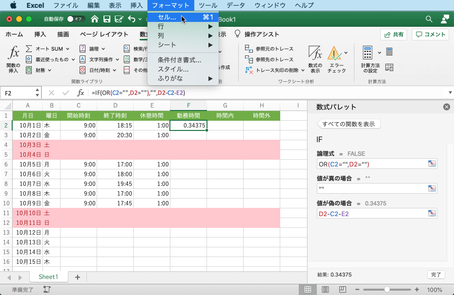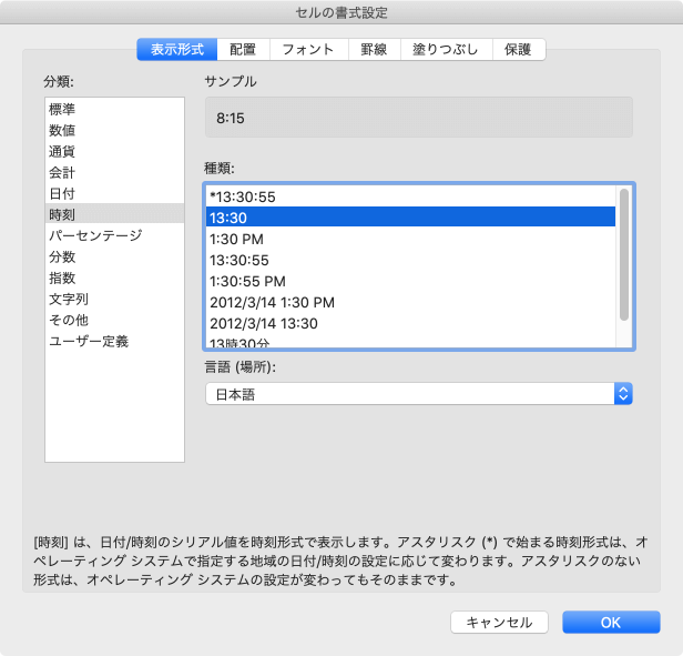 時間がシリアル値になった場合は、commandキーを押しながら1キー、もしくは[フォーマット]メニューの[セル]を選択します。
