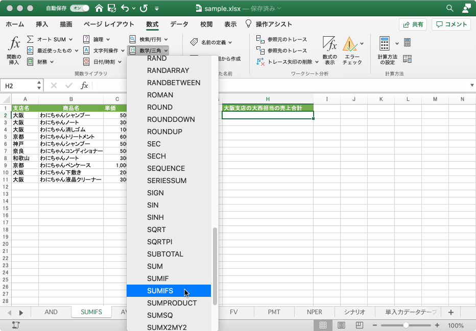 - 合計を求めるセルを選択して、[数式]タブの[数学/三角]から[SUMIFS]を選択します。