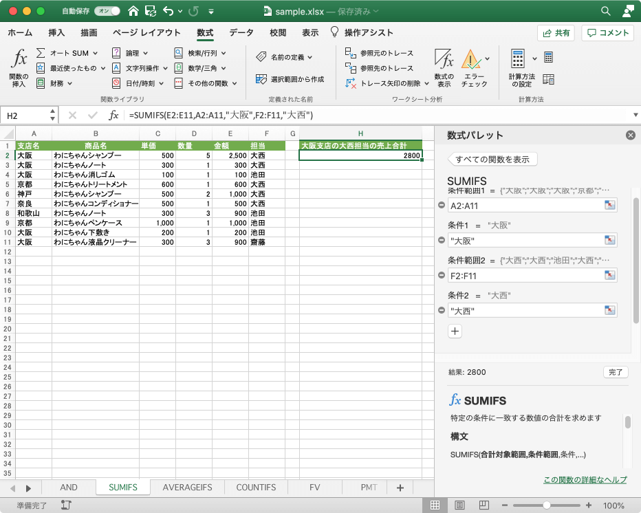 SUMIFS関数は、複数の条件すべて満たす場合に、対応するセル範囲の数値の合計を返します。