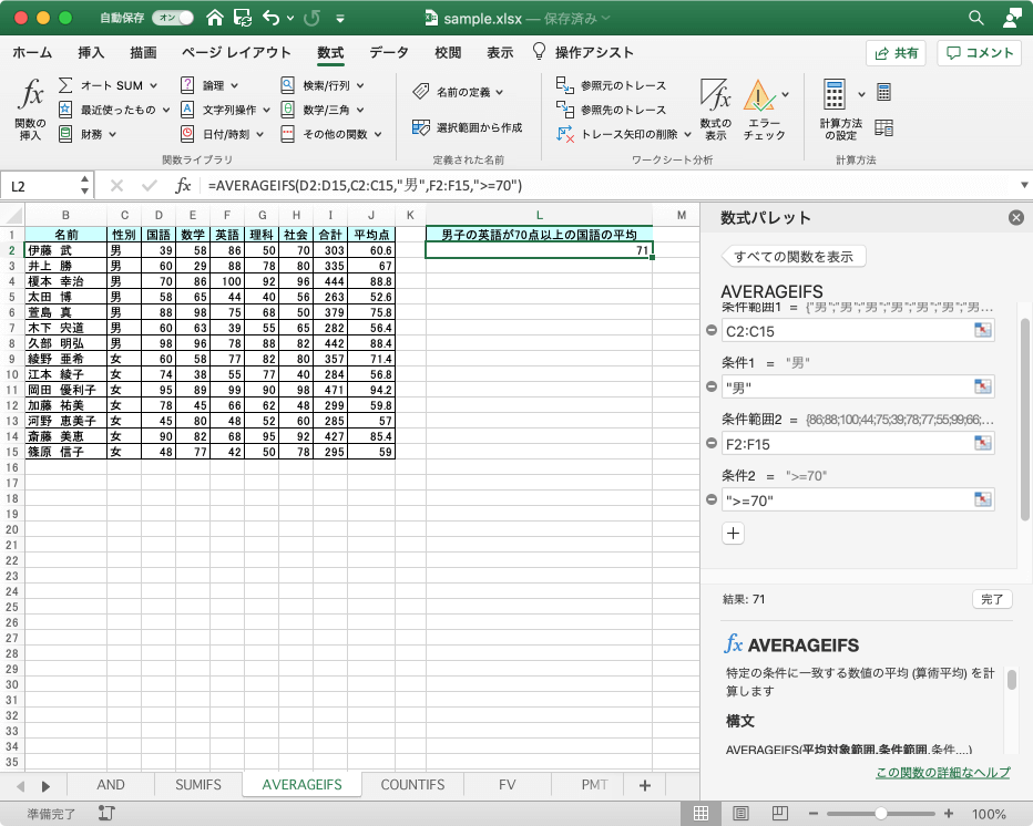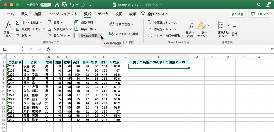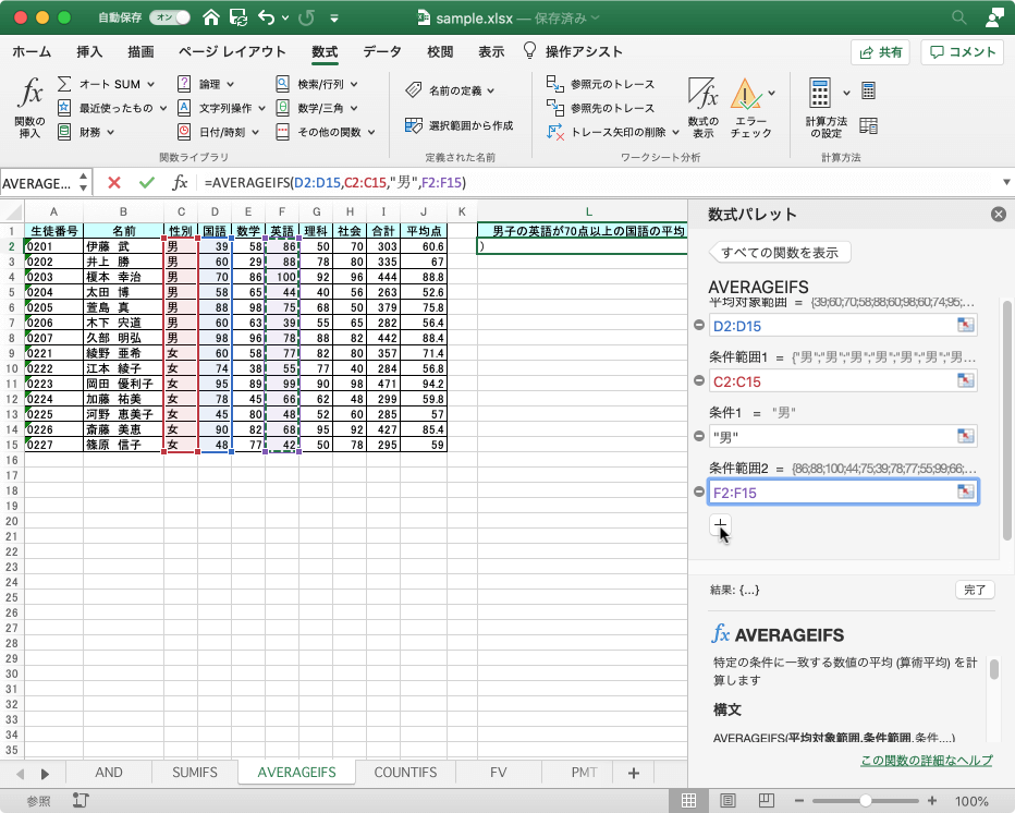ここでは、男子の英語が70点以上の生徒の国語の平均点を求める方法について説明します。