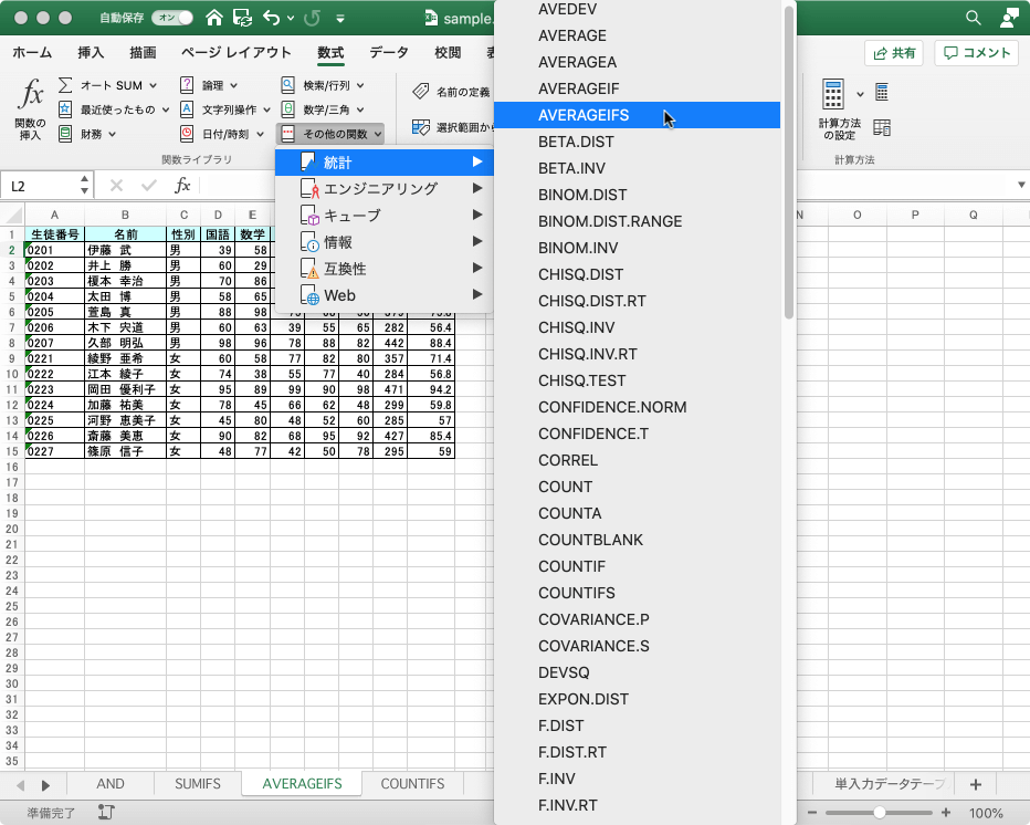 - 一覧から[統計]をポイントして[AVERAGEIFS]を選択します。