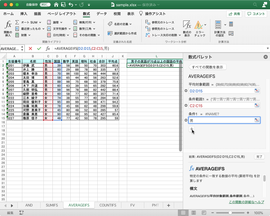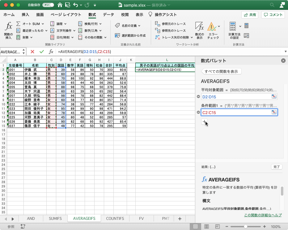 複数の検索条件に一致するすべてのセルの平均値 (算術平均) を返すには、統計関数のAVERAGEIFS関数を利用します。Excel for Macの場合、条件を追加するには、その都度[+]ボタンをクリックしていく必要があります。