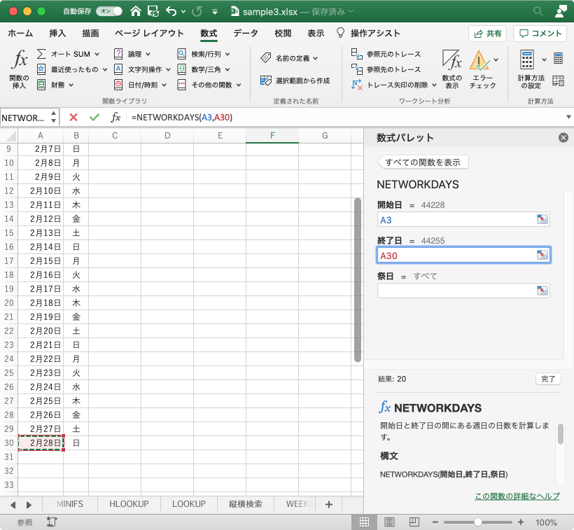 開始日と終了日の間にある週日の日数を計算するには、NETWORKDAYS関数を利用します。経過日数ではなく、指定した日数から週末や祭日を差し引いた日数となります。