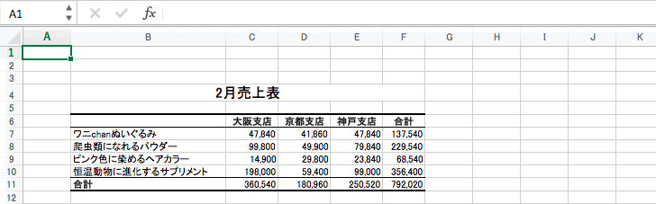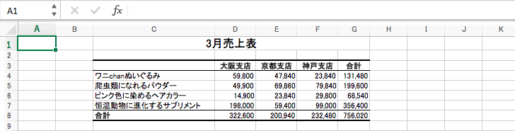 以下のように、1月、2月、3月の売上表の項目の数と並び順は同じだけれども、位置がすべて異なる場合、串刺し集計は行うことができません。この場合、位置を基準にした統合を行います。