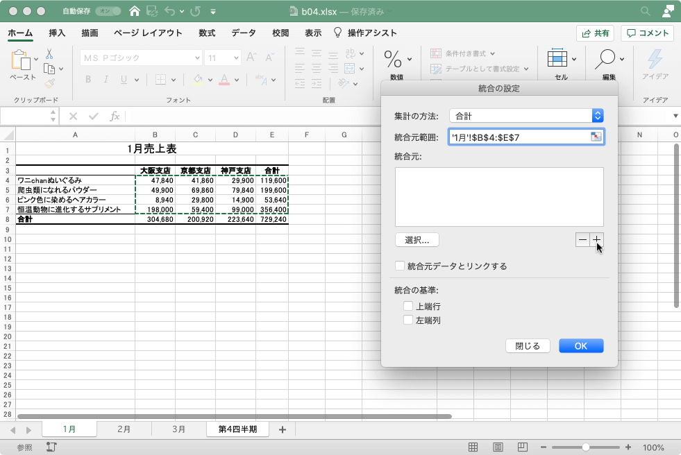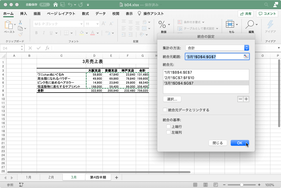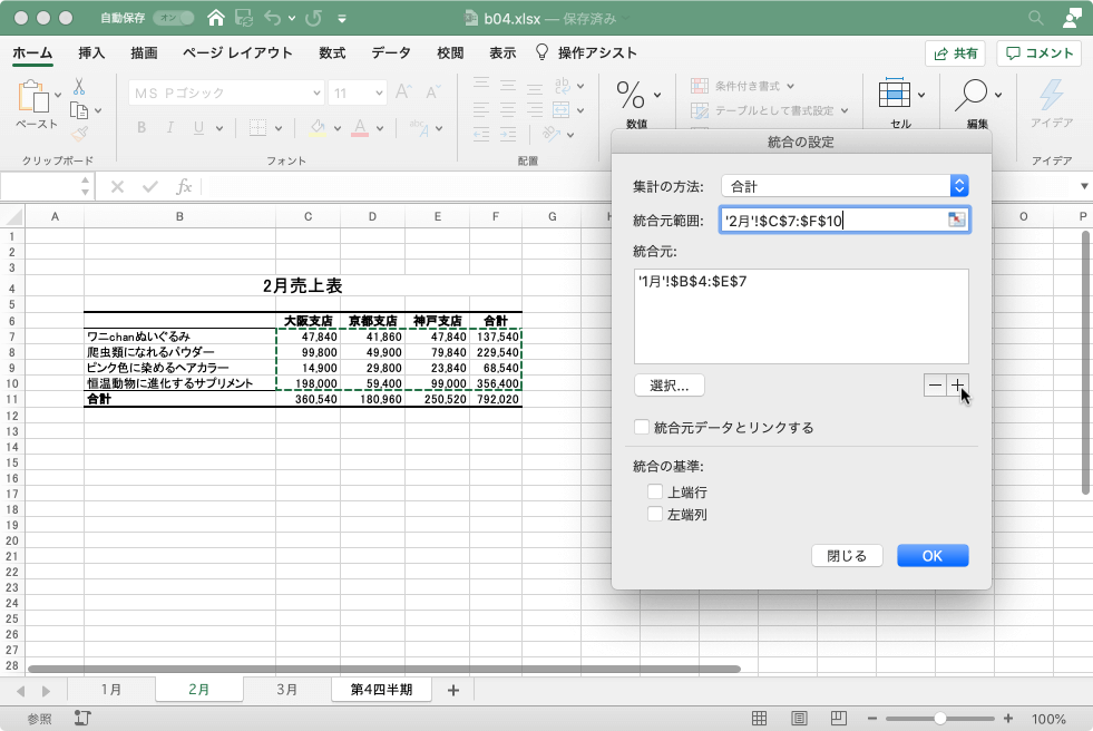 - 同様に2月、3月とデータ範囲をマウスで範囲選択し、統合元を追加していきます。