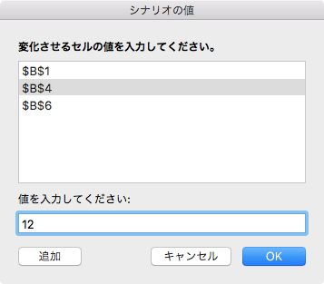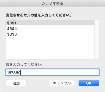 - すべてのセルの値を入力したあと、引き続きシナリオを追加する場合は[追加]ボタンをクリックします。