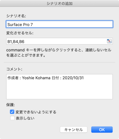 - シナリオに登録したいセルを選択しておきます。Commandキーを押しながらクリックで、離れたセルの複数選択してもOKです。