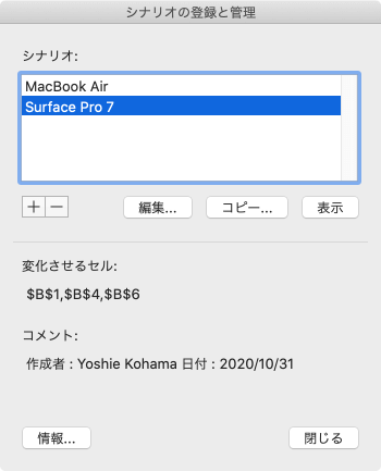 - [シナリオの登録と管理]ダイアログボックスに二つのシナリオが登録されました。