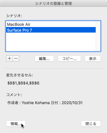 - [シナリオの登録と管理]ダイアログボックスの[情報]ボタンをクリックします。
