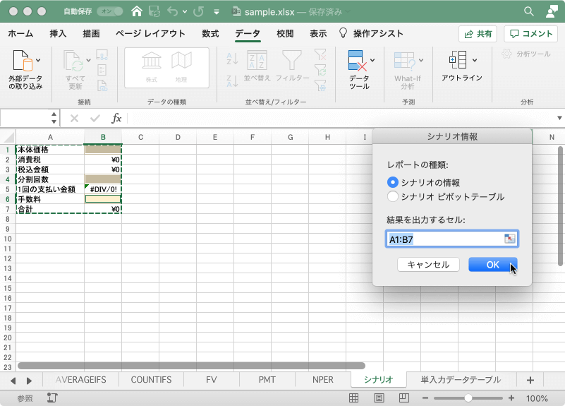 - [ツール]メニューの[シナリオ]を選択するか、[データ]タブの[データツール]グループの[What-If分析]をクリックし、[シナリオの登録と管理]をクリックします。