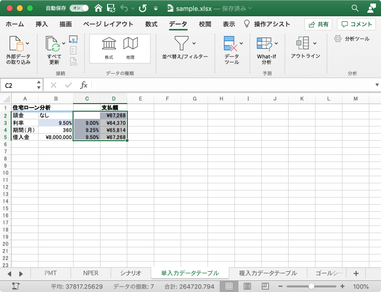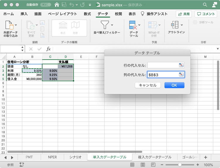 =PMT(B3/12,B4,-B5)を入力し、利率の変数を入力しておきます。 - データテーブルの範囲、C2:D5