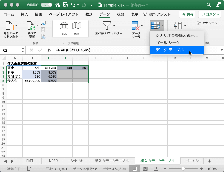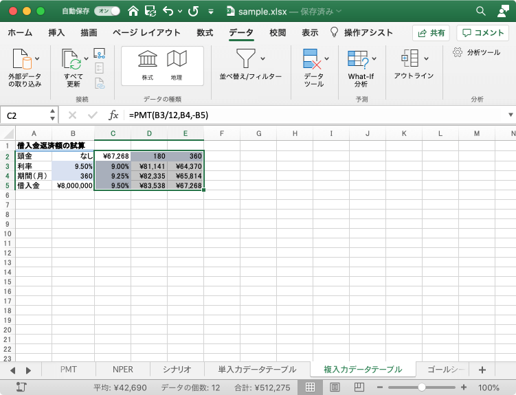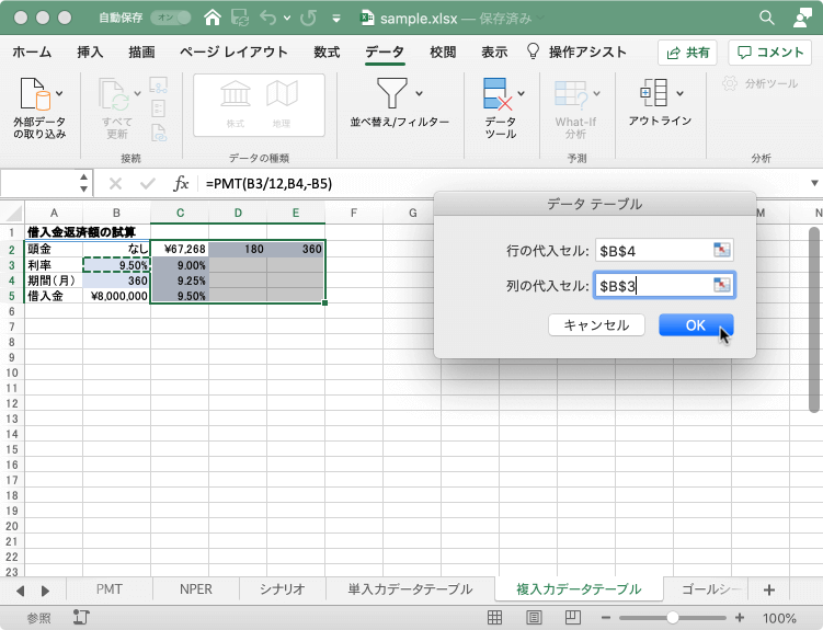 =PMT(B3/12,B4,-B5)を入力し、利率と支払期間の変数を入力しておきます。 - データテーブルの範囲、C2:E5