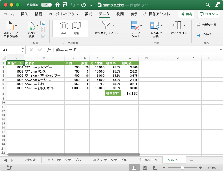 現状の売上が以下のようになっていて、ワニchanシャンプー、ワニchanリンスとワニchanボディシャンプーが在庫切れで、そのほかの3商品にはまだ在庫ある場合、粗利を20000円出したいとき、あとどれくらい販売すればいいのかを求めるには、ソルバーを利用するとよいでしょう。