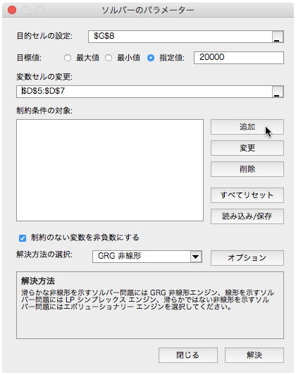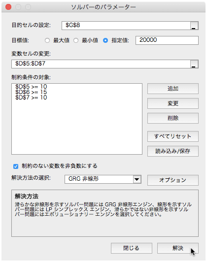 - [ソルバーのパラメーター]の[解決]ボタンをクリックします。