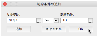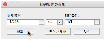 D4セルは10以上、D5セルは15以上、D6セルは10以上という条件を指定します。最後の制約条件を設定できたら[OK]ボタンで閉じます。