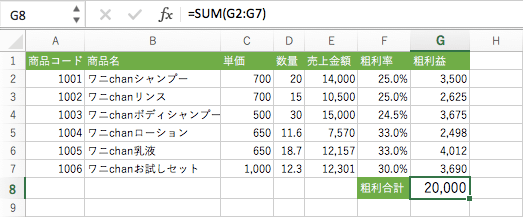 現状の売上が以下のようになっていて、ワニchanシャンプー、ワニchanリンスとワニchanボディシャンプーが在庫切れで、そのほかの3商品にはまだ在庫ある場合、粗利を20000円出したいとき、あとどれくらい販売すればいいのかを求めるには、ソルバーを利用するとよいでしょう。