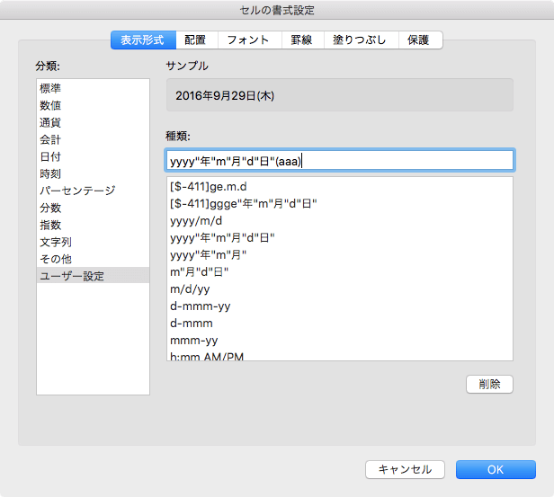 Excel 2016 for Macで[ホーム]タブの[数値]グループの[番号書式]ボックスの▼をクリックして[その他の番号書式]をクリックして[セルの書式設定]ダイアログボックスの[表示形式]タブを開き、[セルの書式設定]ダイアログボックスの[表示形式]タブの[ユーザー設定]から、様々な日付の表示形式を設定できます。