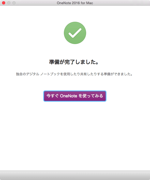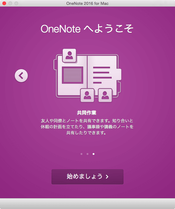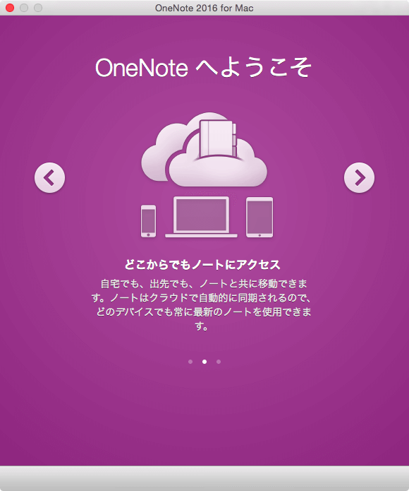 OneNote for Macを初めて起動すると、OneNoteの機能についての紹介画面が表示されます。他のOfficeアプリでMicrosoftアカウントにサインインされている場合は、OneNoteでもサインインされています。MacでOneNoteを使う準備をしましょう。
