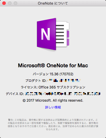 - OneNoteのバージョンとプロダクトIDを確認できます。