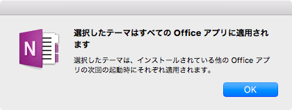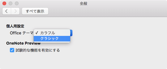 Officeのテーマは「クラシック」と「カラフル」の2種類あります。もう一方のテーマに変更するには[OneNote]メニューの[環境設定]から[全般]を開き、[Office テーマ]を選択します。