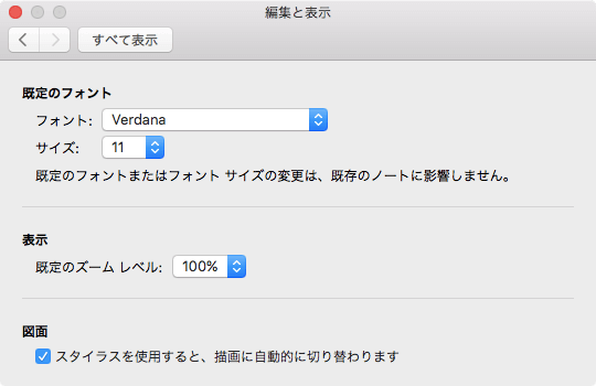 ズームをリセットしたときの既定のズームレベルは100%です。そのズームレベルを変更するには[OneNote]メニューの[環境設定]から[表示と編集]を開き、[既定のズームレベル]一覧から選択します。