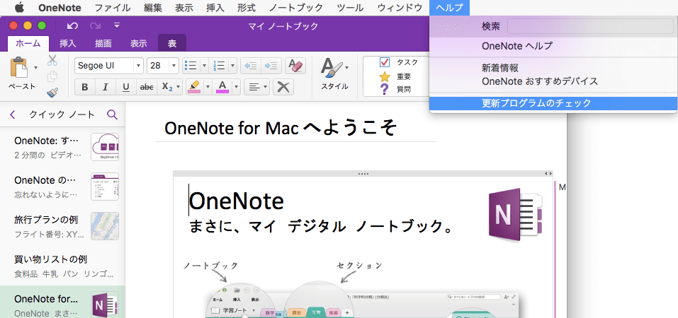OneNote 2016 for Macの更新プログラムを確認するには、[ヘルプ]メニューの[更新プログラムのチェック]をクリックします。Office 365サブスクリプションでインストールされた場合は、Microsoft AutoUpdateで更新プログラムをチェックできます。
