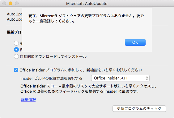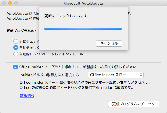 - Microsoft AutoUpdateが開いたら[更新プログラムのチェック]ボタンをクリックします。