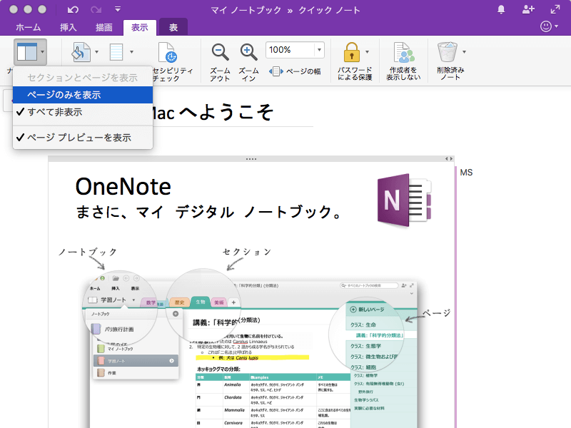 OneNote 2016 for Macでナビゲーションウィンドウをすべて非表示にした後、その設定を元に戻すには、[表示]タブを開き、[ナビゲーションウィンドウ]一覧から[ページのみを表示]を選択します。
