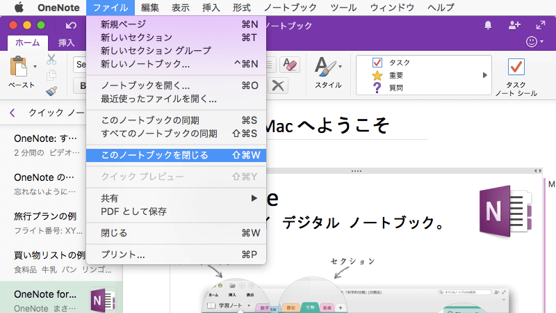 [ファイル]メニューの[このノートブックを閉じる]をクリックします。ショートカットキーはShift+Command+Wです。