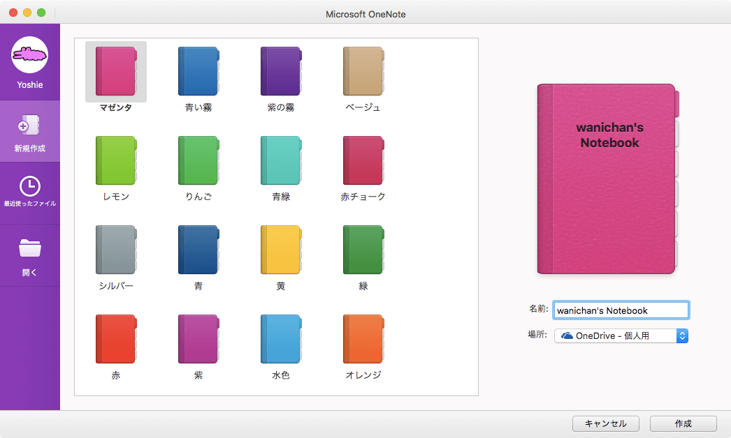 [ファイル]メニューの[新しいノートブック]を選択し、ノートブックの色、場所とノートブックの名前を入力します。現状では日本語ではうまく名前が指定できないので、英数字で入力します。ショートカットキーはcontrol+command+Nです。
