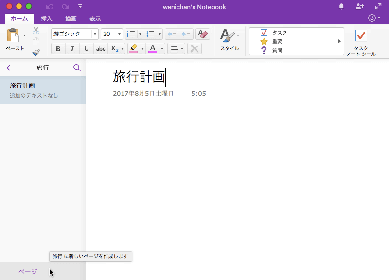 左側のナビゲーションウィンドウのページリストから一番下の[+ページ]をクリックすると、下にページが作成され、ページタイトルフィールドにカーソルが移動するので、ページタイトルを入力します。