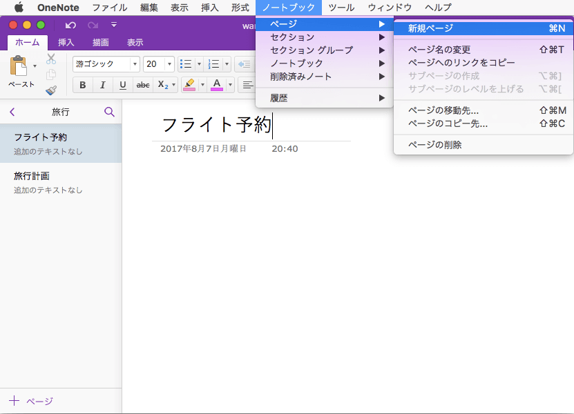 メニューコマンドを利用する場合、[ノートブック]メニューの[ページ]をポイントして[新規ページ]を選択します。ショートカットキーはcommand+Nです。