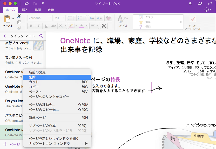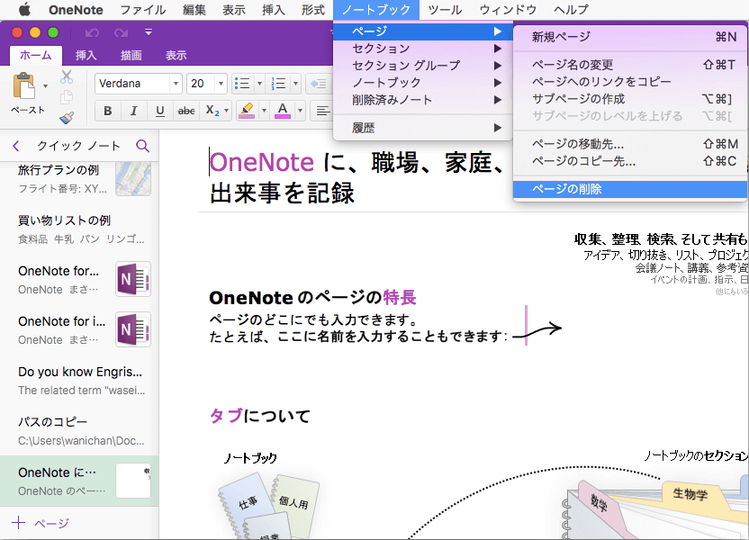 - [ノートブック]メニューの[ページ]をポイントして[ページの削除]をクリックします。