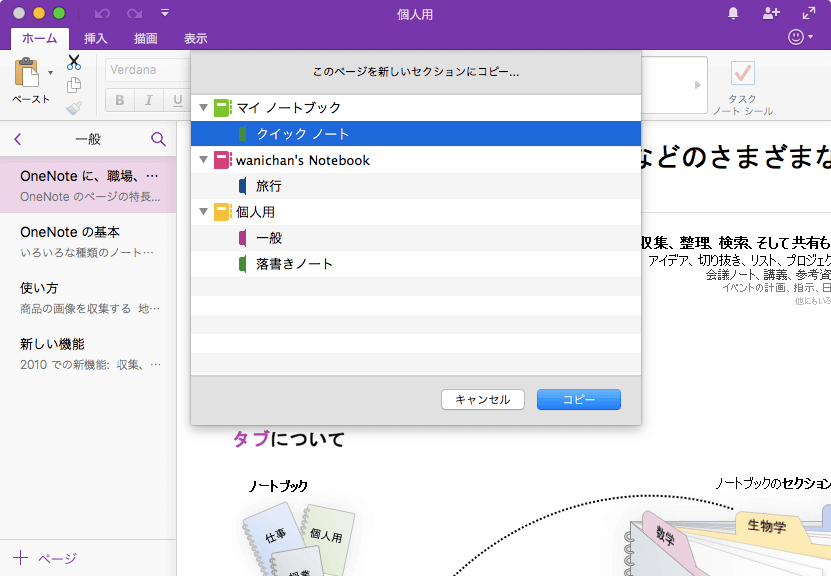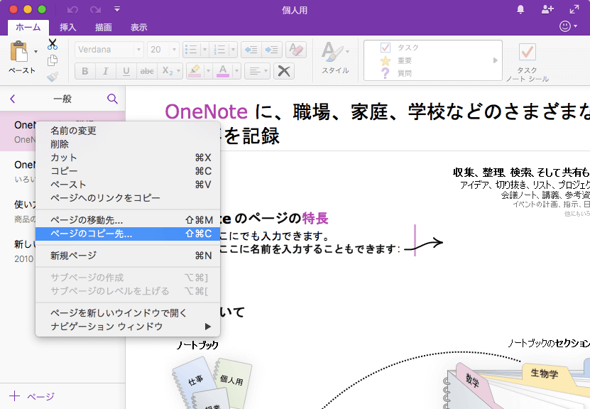 開いているノートブック間で自由にページをコピーすることができます。コピーしたいページを右クリックして、ショートカットメニューより[ページのコピー先]を選択し、コピー先のセクションを選択します。ショートカットキーはShift+Command+Cです。