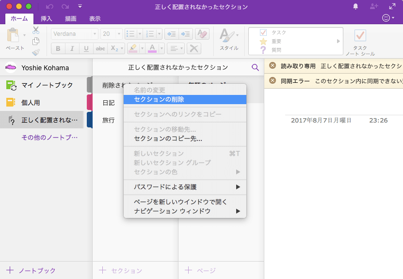 ノートブックの同期がうまくいかずに、「正しく配置されなかったセクション」ができてしまった場合は、必要に応じてそのセクションを他の正常なノートブックにコピーを行ってから、削除するとOKです。