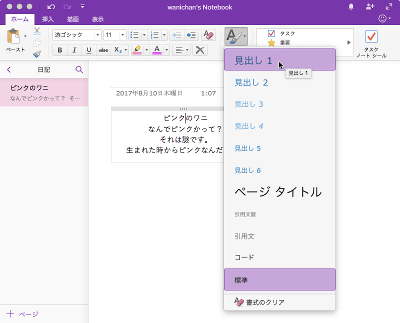 OneNoteでも見出しスタイルを適用できます。「見出し1」~「見出し6」まであります。見出しにしたい段落にカーソルを移動して、[ホーム]タブの[スタイル]一覧から見出しレベルを選択します。[スタイル]一覧にはそのほかにも引用文やコード などあり、Webページに移行するときや、ブログ記事の下書きに便利です。