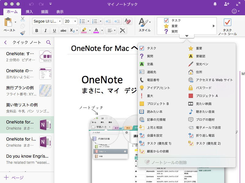 OneNote for Mac では、Windows版のOneNoteから「相談A」「相談B」を除いた 27種類のノートシールが用意されています。ただし、ノートシールの検索は現バージョンではサポートされていません。