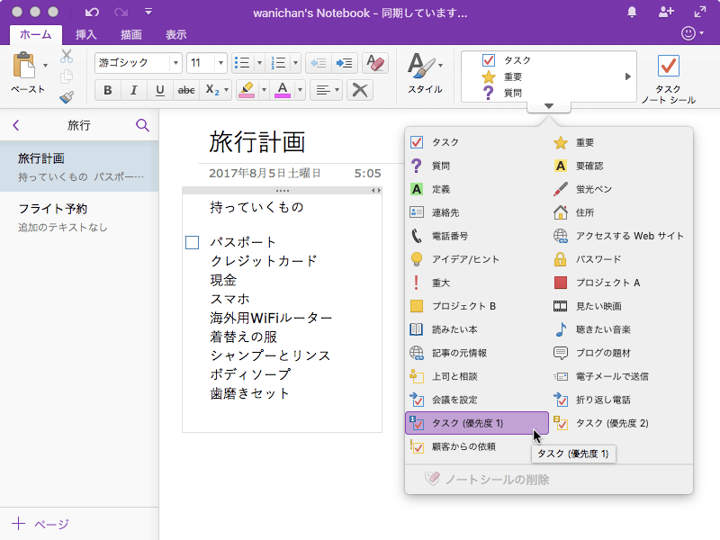 クリックするとチェックマークが付けられる、OneNote 2016 for Macでサポートされているタスクタイプのノートシールは「タスク」「上司と相談」「会議を設定」「折り返し電話」「タスク(優先度1)」「タスク(優先度2)」「顧客からの依頼」です。単純にタスクとしてノートシールを付けるには、[ホーム]タブの[タスク ノートシール]を選択するとOKです。