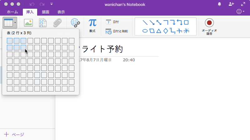 OneNoteではタブ機能が実装されていないため、Tabキーを使うと表に変換されます。そのあとEnterキーを押すと下に行が追加されていきます。[挿入]タブを開き、[表]をクリックして、マウス操作で行列指定して表作成が可能です。