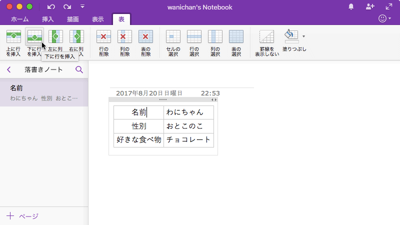 - [表]タブを開き、[下に行を挿入]をクリックします。