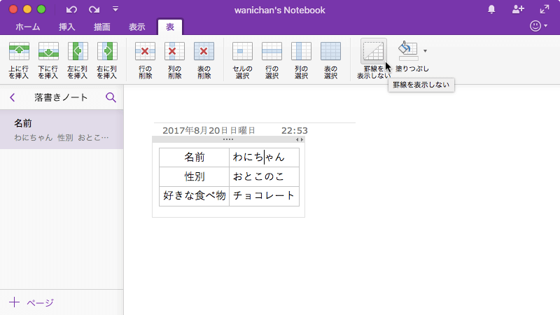 表の罫線を表示しないようにするには、表内にカーソルを移動して[表]タブを開き、[罫線を表示しない]をクリックします。