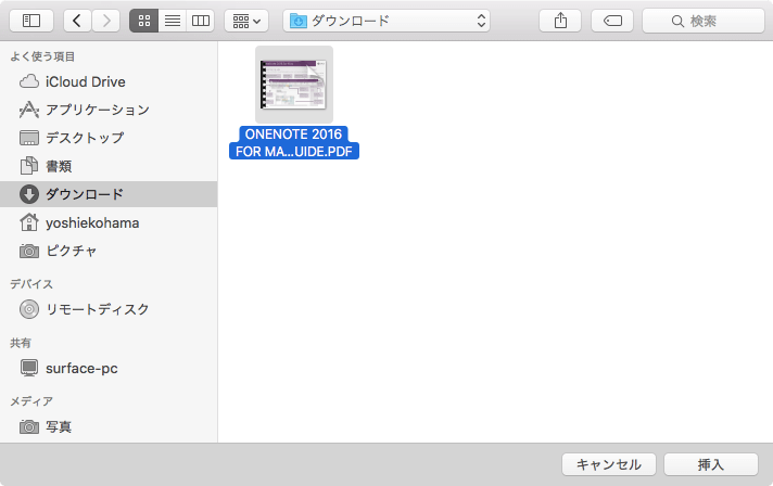 OneNote 2016 for MacでPDF印刷イメージを挿入するには、[挿入]タブを開き、[PDF印刷イメージ]をクリックして、目的のPDFファイルを選択します。そのPDFファイルが添付され、その下に印刷イメージが挿入されます。