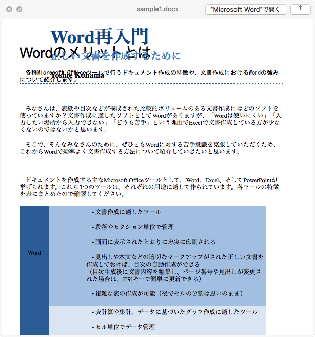 添付ファイルがプレビューとして表示されました。既定のアプリで開くには、右上の["○○"で開く]ボタンをクリックするとOKです。