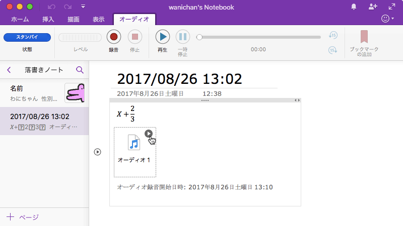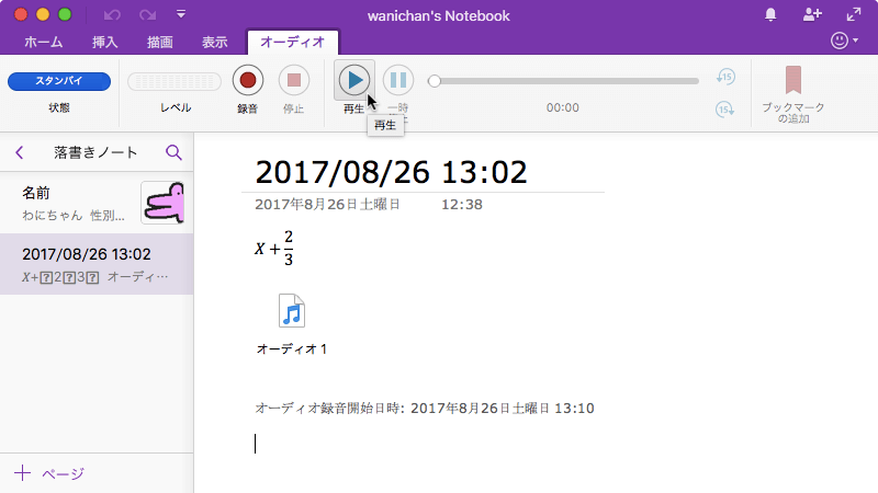 オーディオ録音のアイコンをクリックして[再生]をクリック