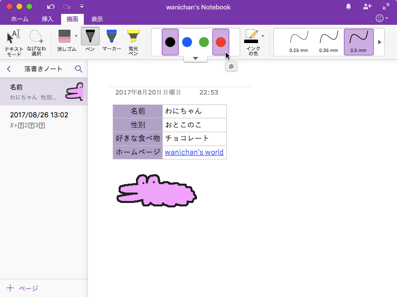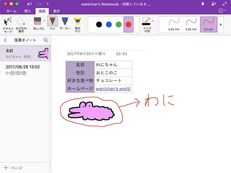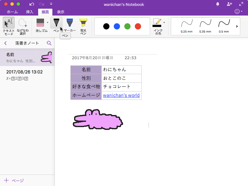 ノートに手書きで文字を書くには、[描画]タブを開き、ペンの種類をペン、マーカー、蛍光ペンから選択してドラッグします。