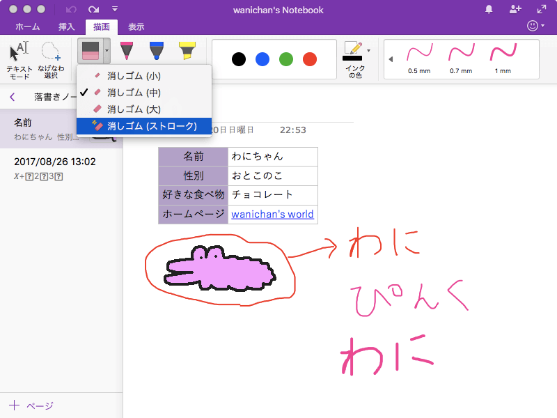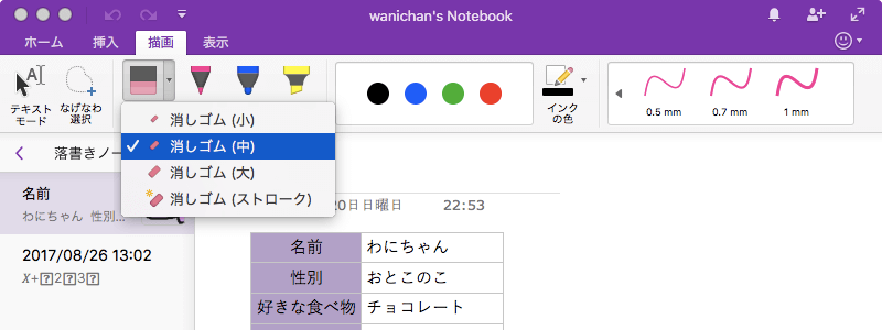 OneNote 2016 for Mac バージョン15.37での既定の消しゴムは消しゴム (中)です。[描画]タブの[消しゴム]をクリックして、消したい部分をなぞるとOKです。ストローク単位で消したい場合は、[消しゴム]の▼をクリックして、一覧から[消しゴム (ストローク) ]を選択します。