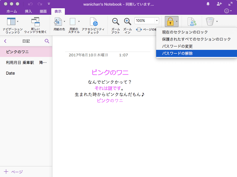 特定のノートブック セクションを保護する必要がなくなった場合は、そのパスワードを解除することができます。[表示]タブを開き、[パスワードによる保護]をクリックして、[パスワードの解除]を選択するか、[ノートブック]メニューの[セクション]をポイントし、[パスワードによる保護]一覧から[パスワードの解除]を選択します。